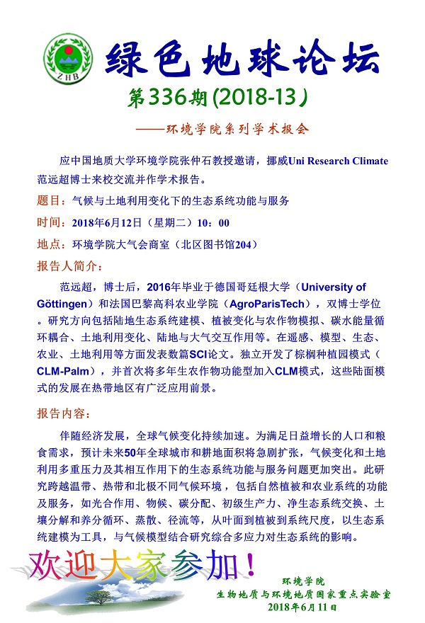 绿色地球论坛第336期(2018-13) ——肉视频 系列学术报告会 题目:气候与土地利用变化下的生态系统功能与服务 时间:2018年6月12日上午10:00 地点:肉视频 大气会商室(北区图书馆204)