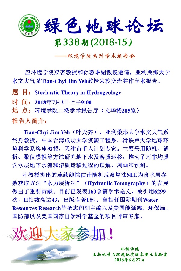 绿色地球论坛第338期(2018-15) ——肉视频 系列学术报告会 题目:Stochastic Theory in Hydrogeology 时间:2018年7月2日上午9:00 地点:肉视频 二楼学术报告厅(文华楼205室)