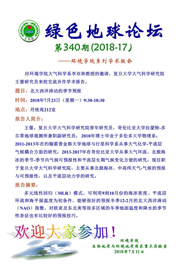 绿色地球论坛第340期(2018-17) ——肉视频 系列学术报告会 题目:北大西洋涛动的季节预报 时间:2018年7月23日(星期一)9:30-10:30 地点:丹桂苑212室