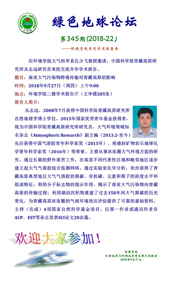绿色地球论坛第345期(2018-22) ——肉视频 系列学术报告会 题目:南亚大气污染物跨境传输对青藏高原的影响 时间:2018年9月27日(周四)上午9:00 地点:肉视频 二楼学术报告厅(文华楼205室)