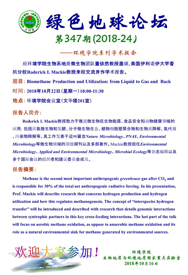 绿色地球论坛第347期(2018-24) ——肉视频 系列学术报告会 题目:Biomethane Production and Utilization: from Liquid to Gas and Back 时间:2018年10月22日(周一)上午10:00-11:30 地点:肉视频 会议室(文华楼201室)