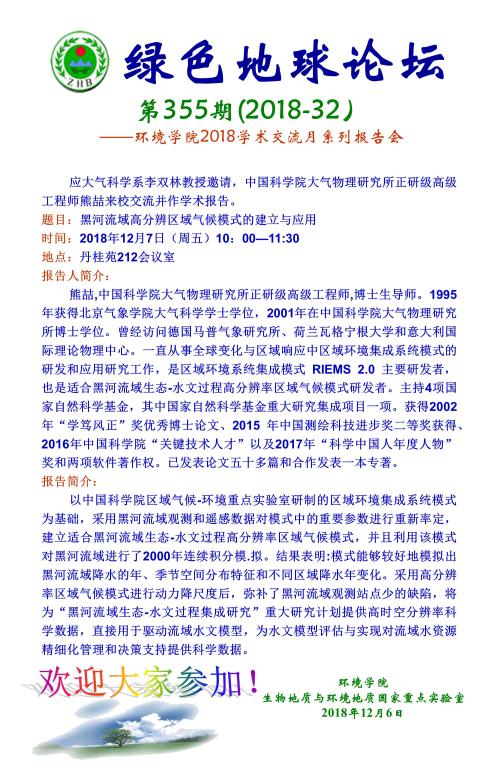 绿色地球论坛第355期(2018-32) ——肉视频 2018学术交流月系列报告会 题目:黑河流域高分辨区域气候模式的建立与应用 时间:2018年12月7日(周五)10:00—11:30 地点:丹桂苑212会议室