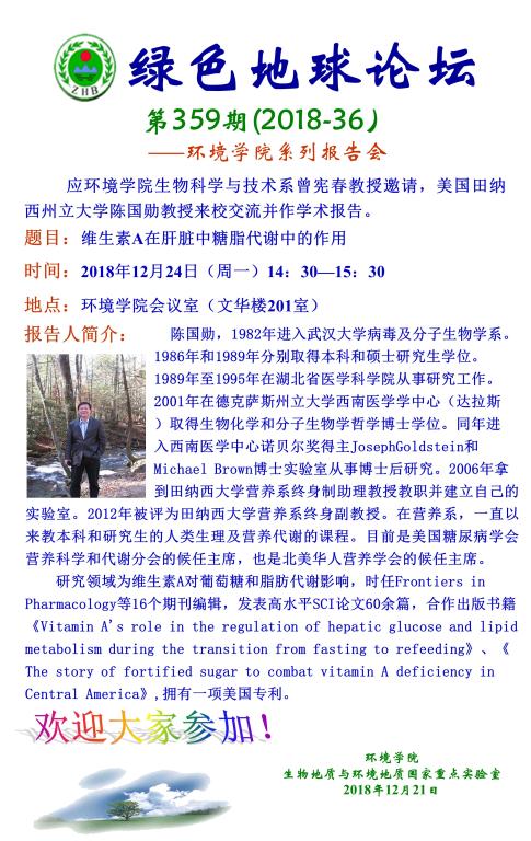 绿色地球论坛第359期(2018-36) ——肉视频 系列学术报告会 题目:维生素A在肝脏中糖脂代谢中的作用 时间:2018年12月24日(周一)14:30 地点:肉视频 会议室(文华楼201室)