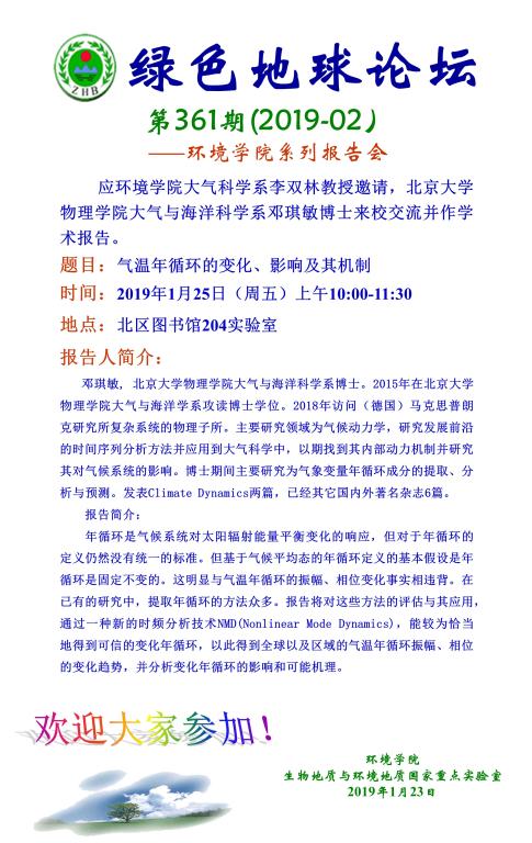 绿色地球论坛第361期(2019-02) ——肉视频 系列学术报告会 题目:气温年循环的变化、影响及其机制 时间:2019年1月25日(周五)10:00—11:30 地点:北区图书馆204实验室