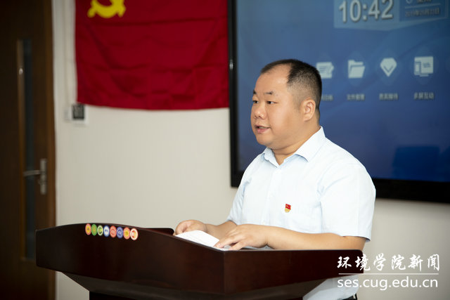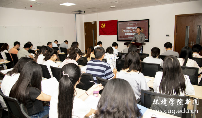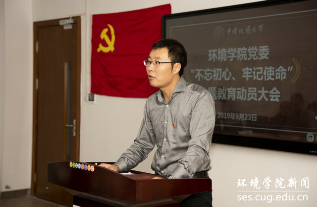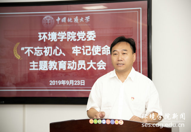 他要求,结合实际、立足本职、学在深处、做在实处、走在前列,做到爱党爱国爱家爱校爱学爱习,实现价值取向与党与祖国人民同心、学术方向与政治方向同向、学术卓越与思想卓越同行、学识魅力与人格魅力同在。一是主题教育重在高质量。院党委与各党支部、院领导与全体师生党员要步调一致,全身心全过程全方位投入主题教育,每个学院领导都不缺、每个师生党支部都不少、每一名师生党员都不落,调动每一位党员积极性主动性创造性,切实保证主题教育高质量开展。二是主题教育重在知行合一。把主题教育中激发出来的工作学习热情和新时代奋斗精神,转化为“为党育人、为国育才,培养新时代生态环保铁军”的实际行动,转化为实现中国梦、地大梦、环境梦的强大精神动力和思想保证,不断推动学院高质量发展和内涵式发展。