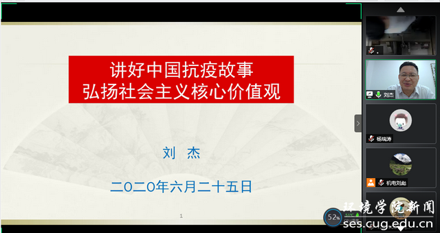 通讯稿于晓舟、刘彪   编辑耿婧)6月25日晚,校党委常委、副校长刘杰与肉视频 和机电学院复研学生、毕业生相约 “云端”,讲授以《讲好中国抗疫故事——弘扬社会主义核心价值观》为主题的“返校复学第一课”。学工处副处长蒋怀柳、两个学院学工组全体老师、复研学生和毕业生近300人线上参与学习。