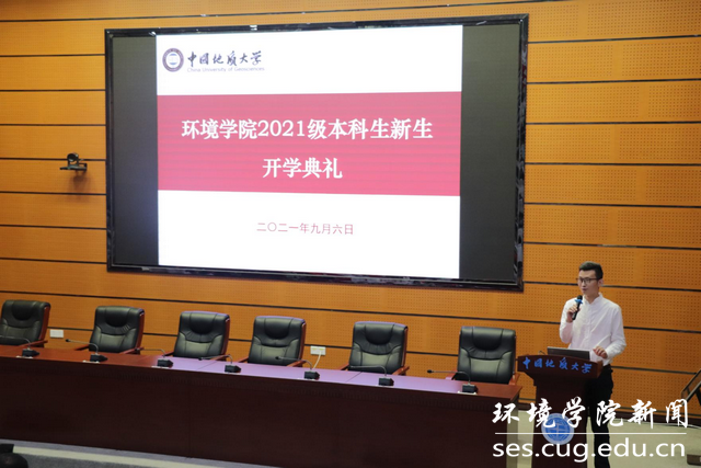 新生代表2021级环境科学与工程大类本科生彭锦蓉与同学们分享学习成长经历,并发出了要成为“地大人”,应该“勇敢地担负起使命、坚定地追逐梦想、不变地坚定思想”的倡议。
